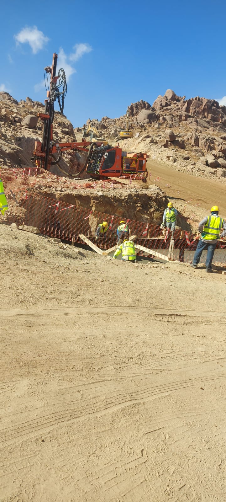The CDC Project in Trojena, Neom involved complex earthwork operations, including excavation, drilling, and blasting, to prepare the site for the construction of an explosive magazine and supporting road networks.